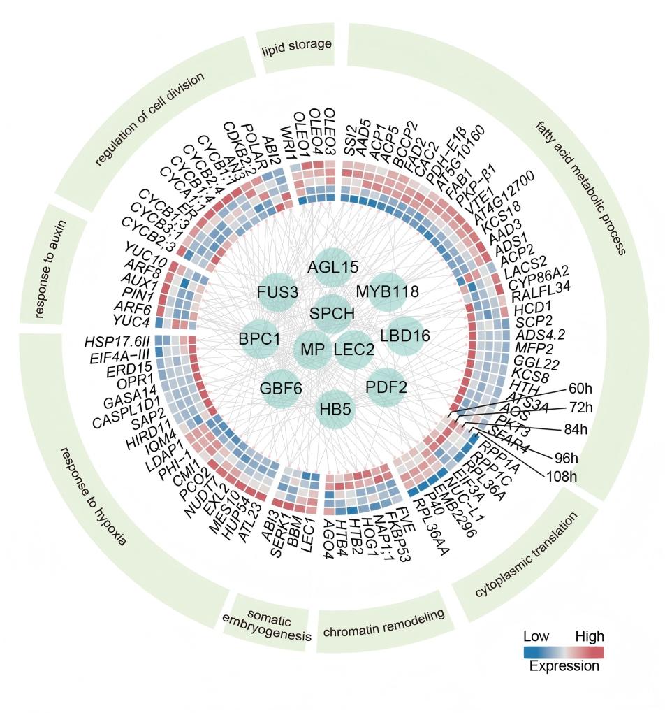 植物体细胞重编程形成全能干细胞的分子调控网络。(受访单位供图) 张宪省介绍,这一发现首次定义了“普通细胞”向“全能性胚胎”转变的分子路径,有助于理解植物细胞发育的根本规律,为作物遗传改良与高效再生提供了全新理论支撑,也为珍稀植物种质资源的高效保护、植物合成生物学发展注入了新动力。