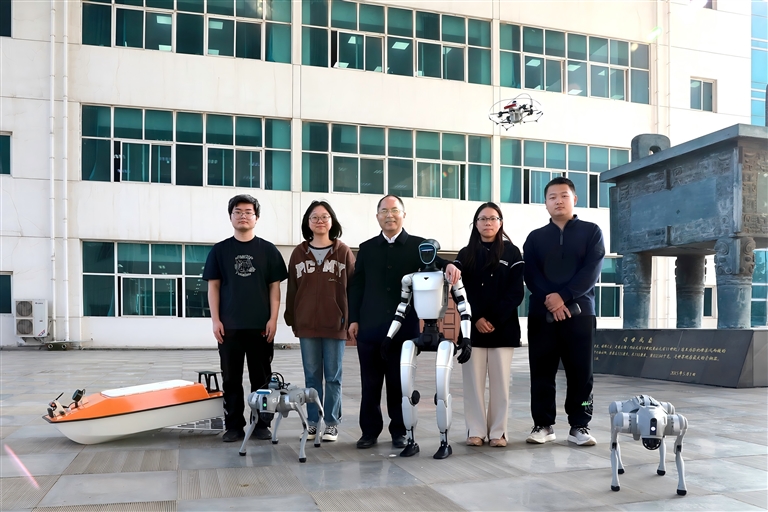 夏元清(左三)和学生一起展示无人机、无人船、人形机器人、机器狗等无人系统集群的协同控制。