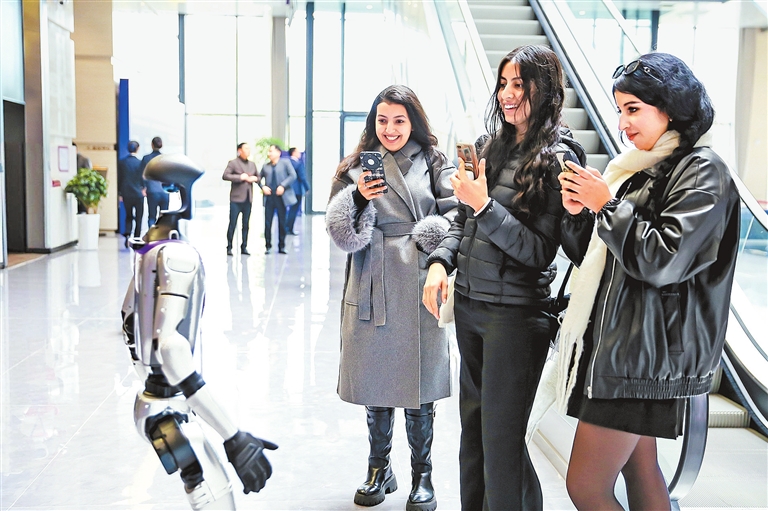 担任迎宾的机器人“创小港”憨态可掬,引得与会人员纷纷与之合影、互动。本文图片均为河南日报社全媒体记者 徐聪 摄