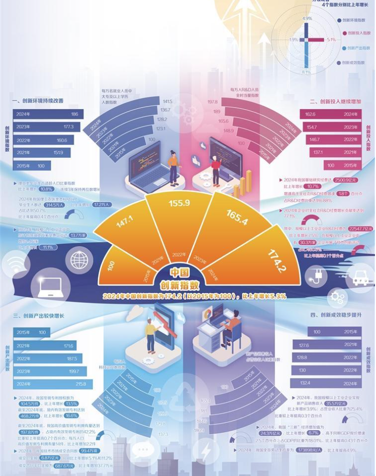 国家统计局数据显示,2024年中国创新指数为174.2(以2015年为100),比上年增长5.3%。我国科技创新能力持续提升,创新产出较快增长,发展新动能不断壮大,为经济高质量发展提供有力支撑。