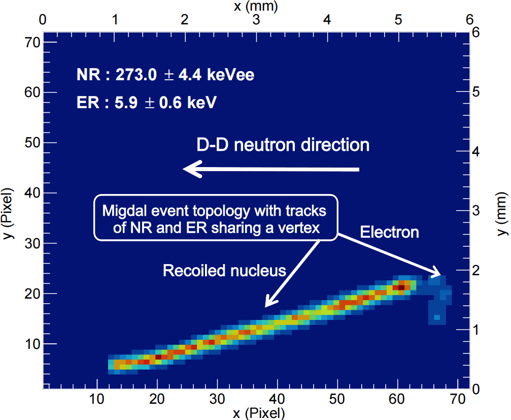 据中国科学院大学教授刘倩介绍,团队自主研发了“微结构气体探测器+像素读出芯片”组合的超灵敏探测装置,相当于可拍摄“单原子运动中释放电子过程”的“照相机”。利用紧凑型氘—氘聚变反应加速器中子源,轰击“照相机”内的气体分子,会同时产生原子核反冲与米格达尔电子,二者形成“共顶点”的独特轨迹。通过分析这一特征,团队成功地将这种“米格达尔事件”从伽马射线、宇宙射线等背景干扰中区分开来。首次直接证实了1939年利用量子力学预言的米格达尔效应。