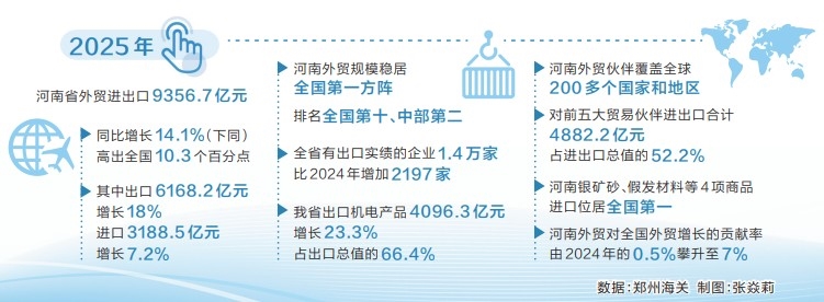 2025年,河南外贸进出口9356.7亿元,同比增长14.1%,高出全国10.3个百分点;全年出口规模居全国第一方阵,展现出十足的韧性。